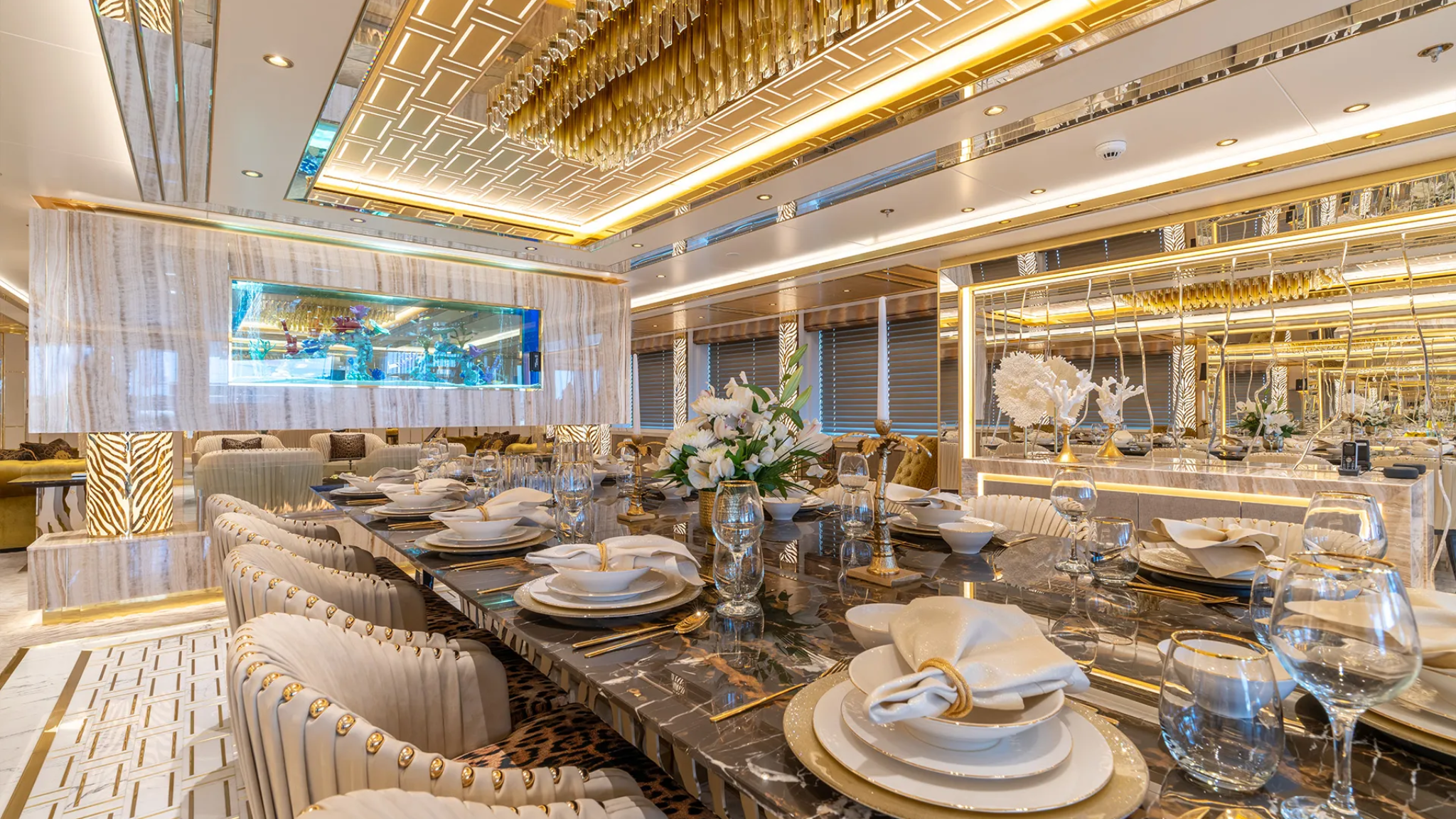 A massive 1,730 GT volume and an impressive 6,000 nautical mile range at economic speeds. An opulent Grecian-style beach club with a fiber-optic "starry sky" ceiling, a private owner’s deck with a dedicated plunge pool, and a cinema lounge finished in ruby-red velvet. The yacht is equipped with advanced anti-drone technology and voice-activated controls for ultimate security and convenience. Designed to IMO Tier III standards, Leona combines eco-friendly performance with high-octane aesthetics, making it an icon on the Mediterranean skyline.