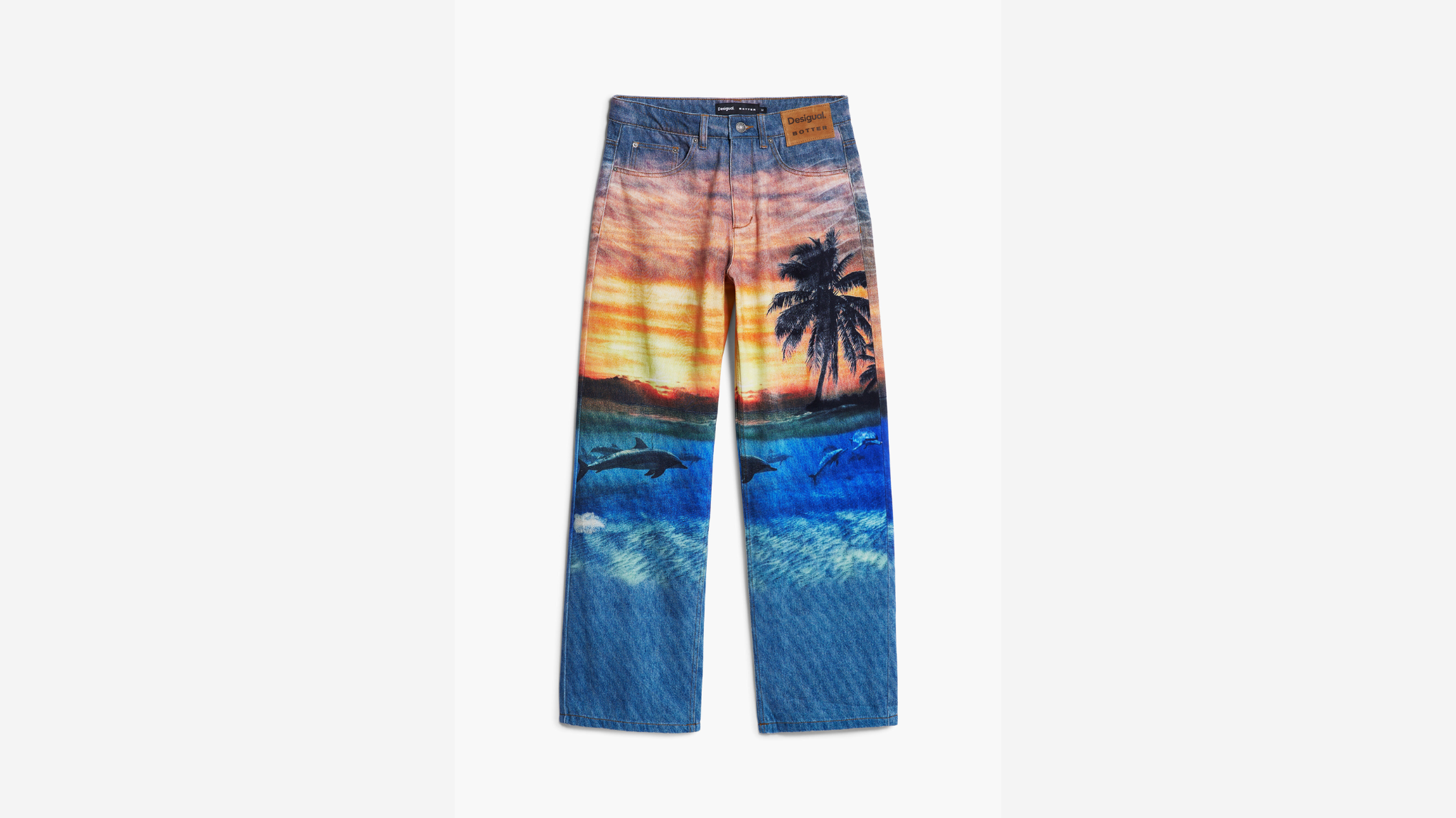 • Sunset Denim Trouser: This is a relaxed boyfriend-cut denim piece defined by an exclusive, vivid sunset-inspired print. The print includes marine animals and palm trees. These trousers also feature subtle dolphin embroidery on the lower leg, perfectly merging art and street style. They are made from 100% cotton.