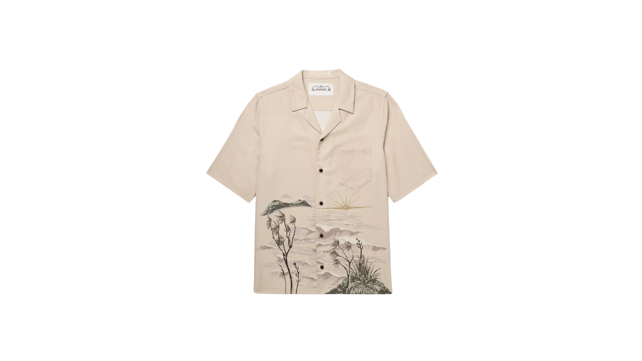 1. Stormy Waters Camp-Collar Shirt (MANAAKI): A short-sleeve shirt made from soft, lightweight lyocell-twill. It features a dark stormy waters print and a relaxed camp collar, making it a comfortable choice for humid weather.
