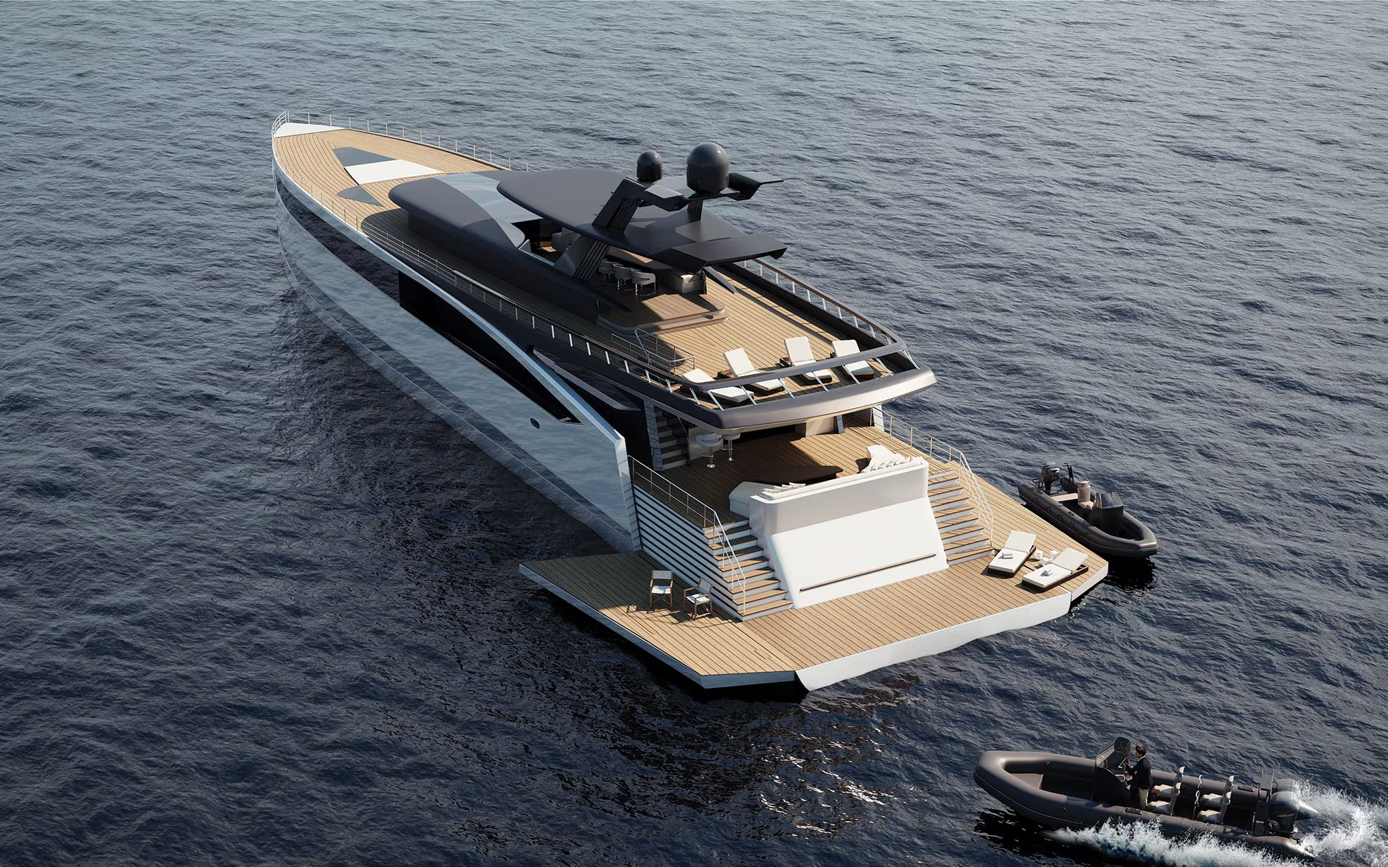 Eco-efficient propulsion and a shallow 2.3m draft for Mediterranean and Caribbean exploration. Massive 285m² sundeck and a 200m² aft beach deck with fold-down platforms that create an immersive sea-level terrace. The interior focuses on natural light, featuring skylights in the Owner’s suite and VIP cabins for starlit nights at sea. A versatile second salon adapts into a cinema, gym, or spa, while an indoor-outdoor bar facilitates a seamless flow between the main deck and the ocean.