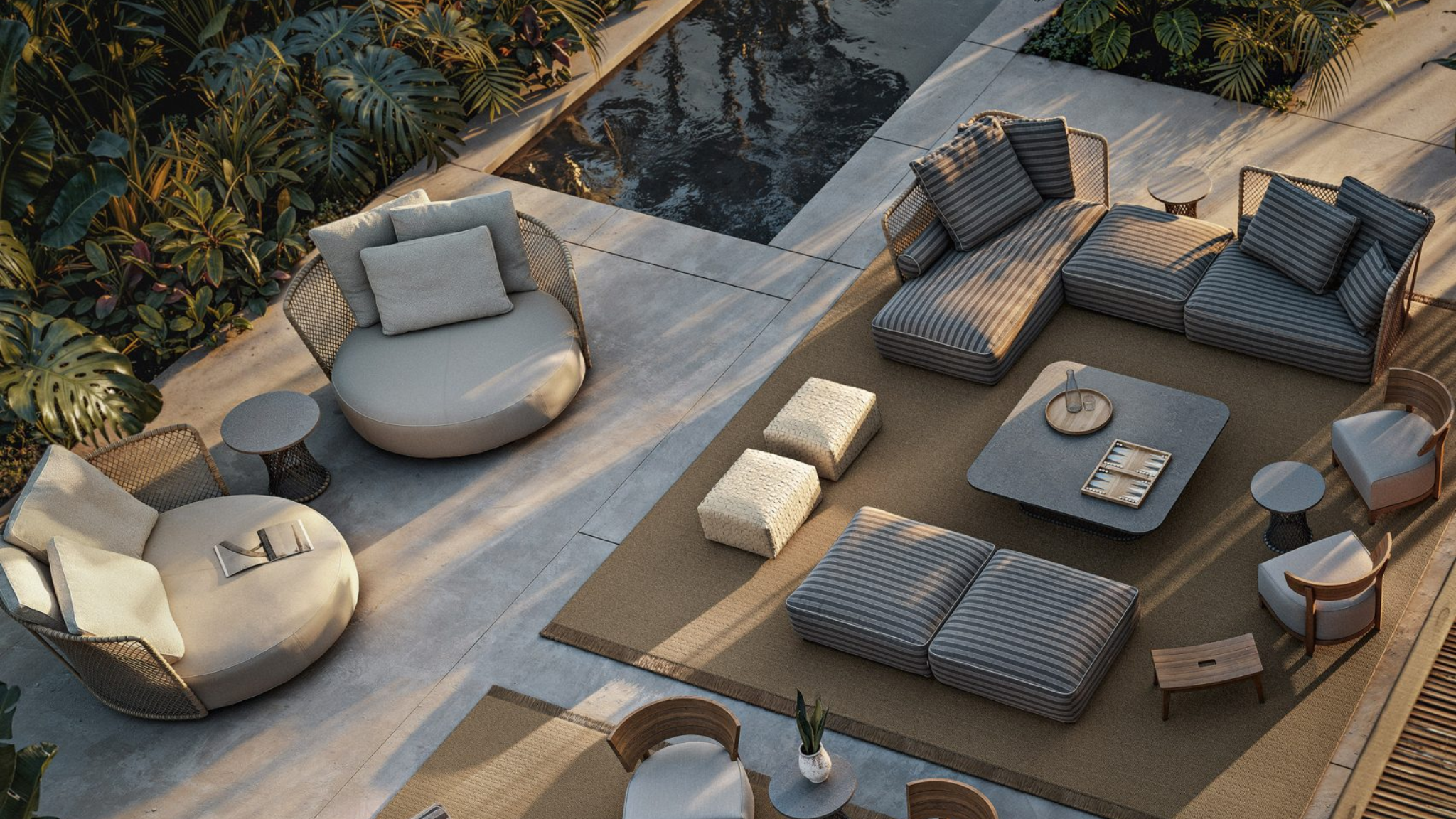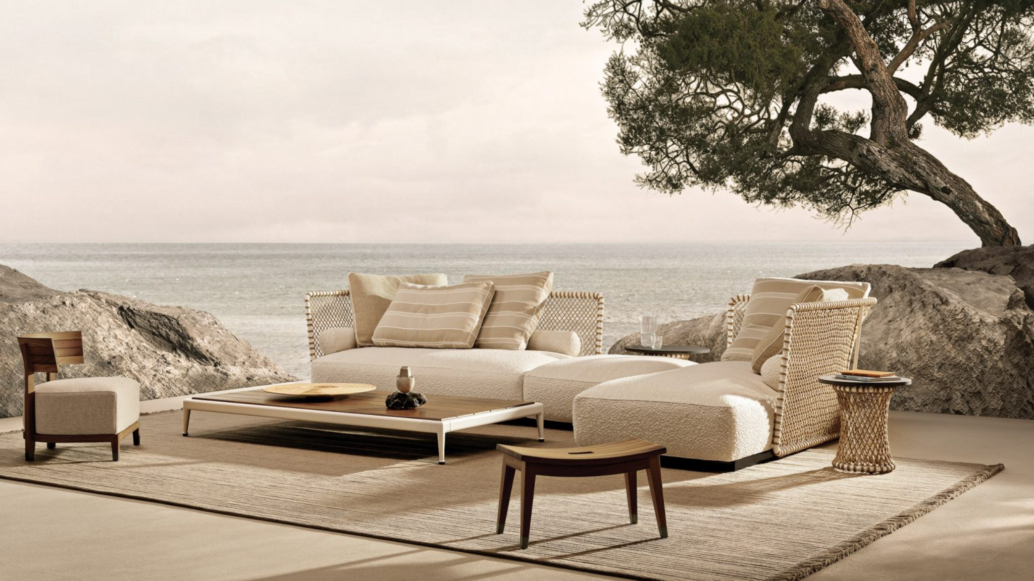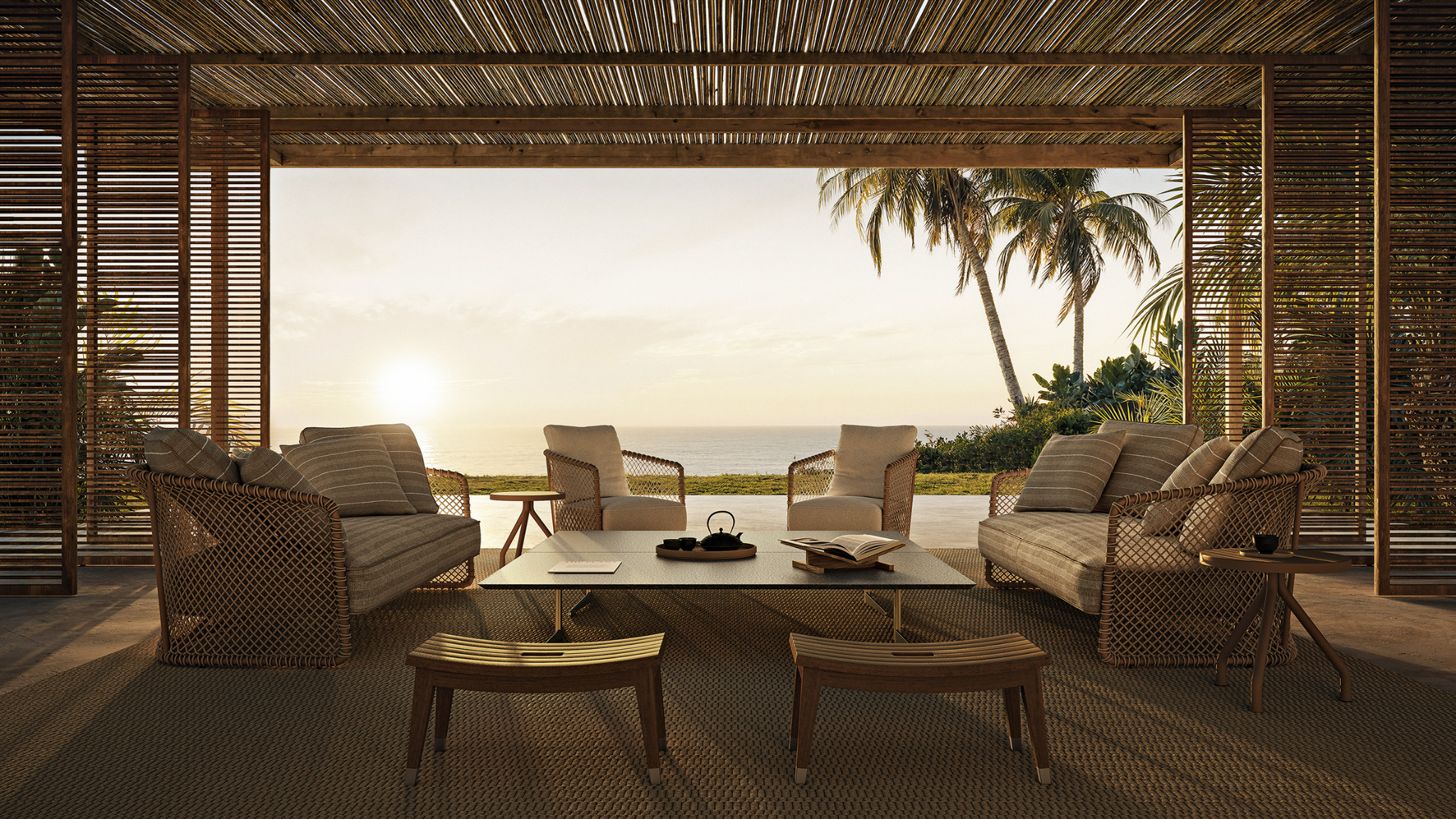 Crafted with a solid iroko wood structure and intricate hand-woven polypropylene fiber, the Oasis offers a tactile richness that ages gracefully. Its modular nature allows for an intentional arrangement of space, while the generous, water-repellent cushions provide a sense of grounding and relaxation. Every line is considered, every material chosen for its ability to endure, ensuring that the Oasis remains a timeless centerpiece of the coastal lifestyle.
